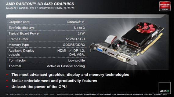 Pro zajímavost: procesor AMD A-Series s nejpomalejší grafikou bude mít 160 stream procesorů, varianta s rychlejší grafikou už dostane 320 stream procesorů. Je samozřejmě pravda, že tyto procesory ještě nejsou na trhu a ještě nějakou chvilku nebudou, nicméně máme pocit, že pouze vylepšit výkon Radeonu HD 5450, a to přibližně na 1,5 až 2násobek, není zas až takové terno. Pokud však máte starší počítač s grafikou, která ještě hardwarovou akceleraci přehrávání videa tak docela nezvládá, je koupě Radeonu HD 6450 určitou možností. Cena byla stanovena na $55, což je necelá tisícikoruna.