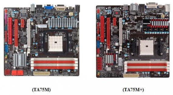 - TA75M - micro ATX, 2× PCI-E 16×, 1× PCI-E 1×, 1× PCI, 6× SATA 3, 2+2 USB 3.0