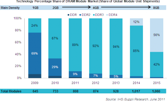 Podle grafu, který vytvořili v iSuppli, se má podíl DDR3 už jen mírně zvyšovat, přitom s DDR2 paměťmi se budeme setkávat ještě hodně dlouho, i když jen v malém množství. Zajímavá je také stupnice běžného množství paměti v PC, až na rok 2015 se počítá s tím, že by se mainstreamem mělo stát 8 GB (což mají někteří v PC už dnes, a to i v DDR2 provedení).