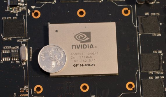 GPU je u této třídy karet Nvidia tradičně kryto tepelným rozvaděčem, odstrojenou podobu čekejme až u modelu s označením "550" - toho se jistě dočkáme záhy (tipujeme únor). Mimochodem, mezní teplotou GPU GF114 je 100 °C.