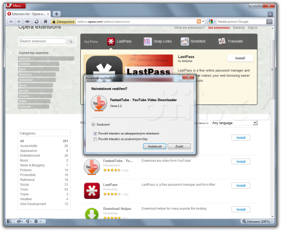 Velkou novinkou pro operu je podpora rozšíření. Protože tuto funkci mají konkurenční prohlížeče již hezky dlouho, není jistě třeba vysvětlovat, oč jde, přesto pokud chcete, můžete se opět podívat na názorné video.