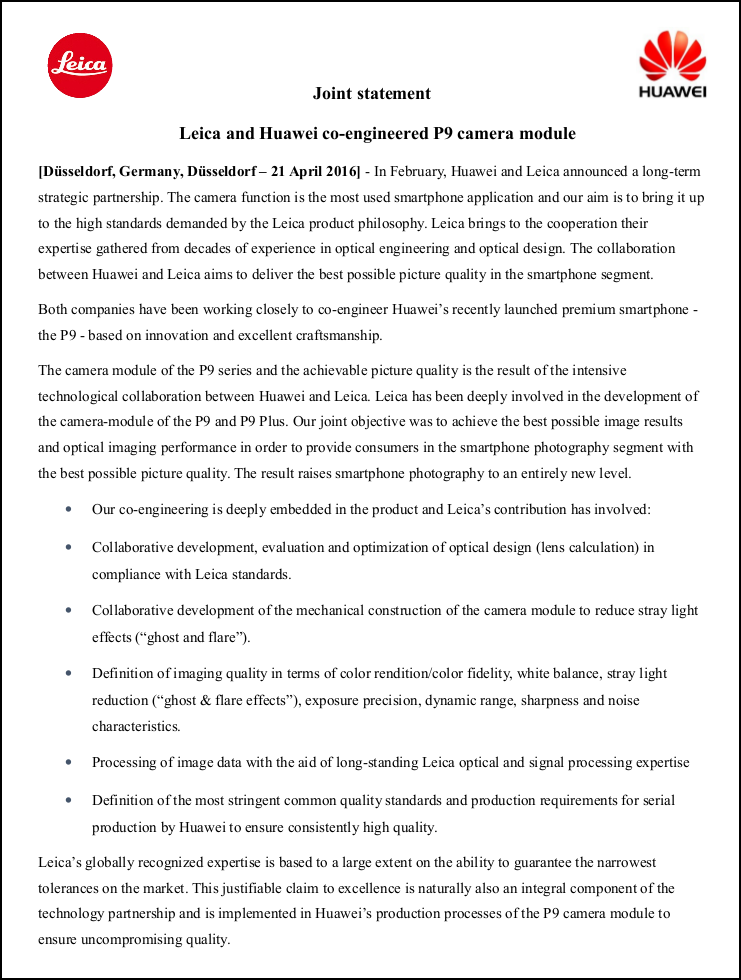 Dle oficiální tiskové zprávy obou firem obě firmy úzce spolupracovaly a výsledkem je celý fotomodulek v Huawei P9, stejně jako kvalita fotografií, které z něj vychází. Leica byla hluboce zapojena do vývoje fotomodulku v oblastech jako optimalizace optického designu (výpočet objektivu/ů) a jeho hodnocení, návrhu mechanické části konstrukce k redukci nežádoucích jevů jako ghosting/flares. Dále pak v definování výstupní kvality snímků co se týče renderingu barev/barevné věrnosti, vyvážení bílé, redukce nežádoucích jevů, přesnosti expozice, dynamického rozsahu, ostrosti a šumové charakteristiky. Spolupráce s Leicou využívá i její zkušenosti v oblasti zpracování signálů.