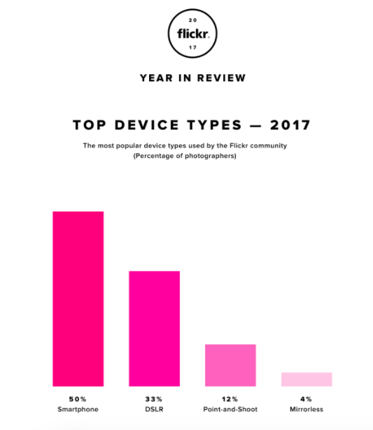 Statistika ukazuje jasně – v roce 2017 bylo nejvíce nahraných fotografií pořízeno chytrým telefonem, a to v zastoupení (50 %), následované zrcadlovkami (33 %), dále kompaktními fotoaparáty (12 %), a někde na konci bezzrcadlovkami (4 %).