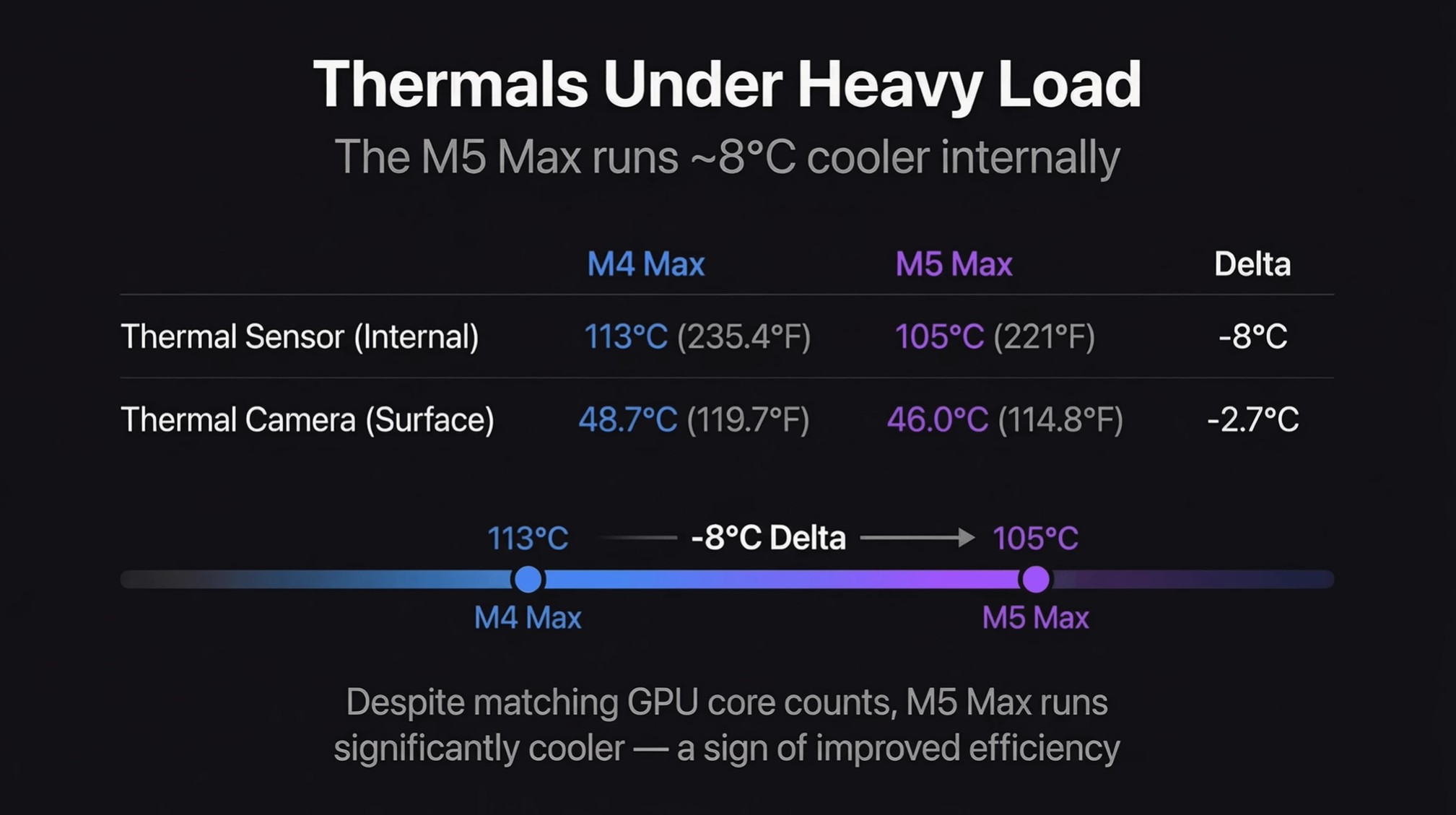 Jak se vyvinule energetická stránka? YouTube kanál Matt Talks Tech vedle sebe postavil M4 Max a M5 Max, na obou spustil zátěž CineBench a jal se měřit. Na M4 Max zaznamenal nejvyšší teplotu snímačem v SoC 113 °C (tedy ještě o 3 °C více než 110 °C, kterou jsme citovali z měření uživatele MarionberryDear6170 ve výše zmíněném článku), zatímco maximální teplota M5 Max byla 105 °C.