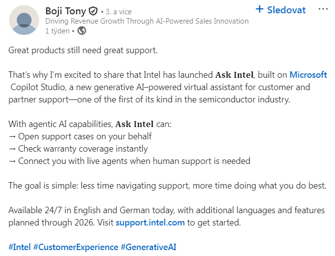Intel spouští nového AI asistenta (Intel @LinkeIn)