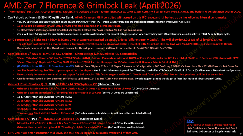Nově se dozvídáme, že tato řada procesorů Epyc ponese kódové označení Florence, oddělená L3 je označována jako Steamboat. Čiplet ponese fyzicky 36 jader Zen 7c, přičemž je možné, že část bude z důvodu zvýšení výtěžnosti vypnuta. Čiplet s jádry na procesu TSMC A14 dosáhne plochy 107 mm², vrstva s L3 cache by měla dosahovat 117 mm². Vrstva s L3 cache doplní čipletu 7 MB L3 cache na jádro (v současnosti nabízí integrovaná L3 cache 4 MB na jádro, takže jde o 75% navýšení), což znamená až 2016 MB L3 cache na socket.