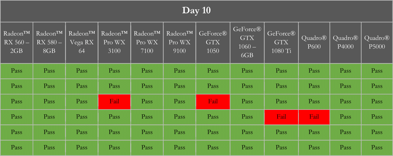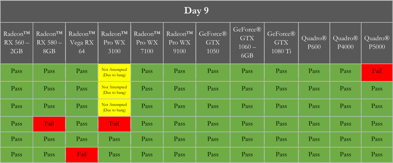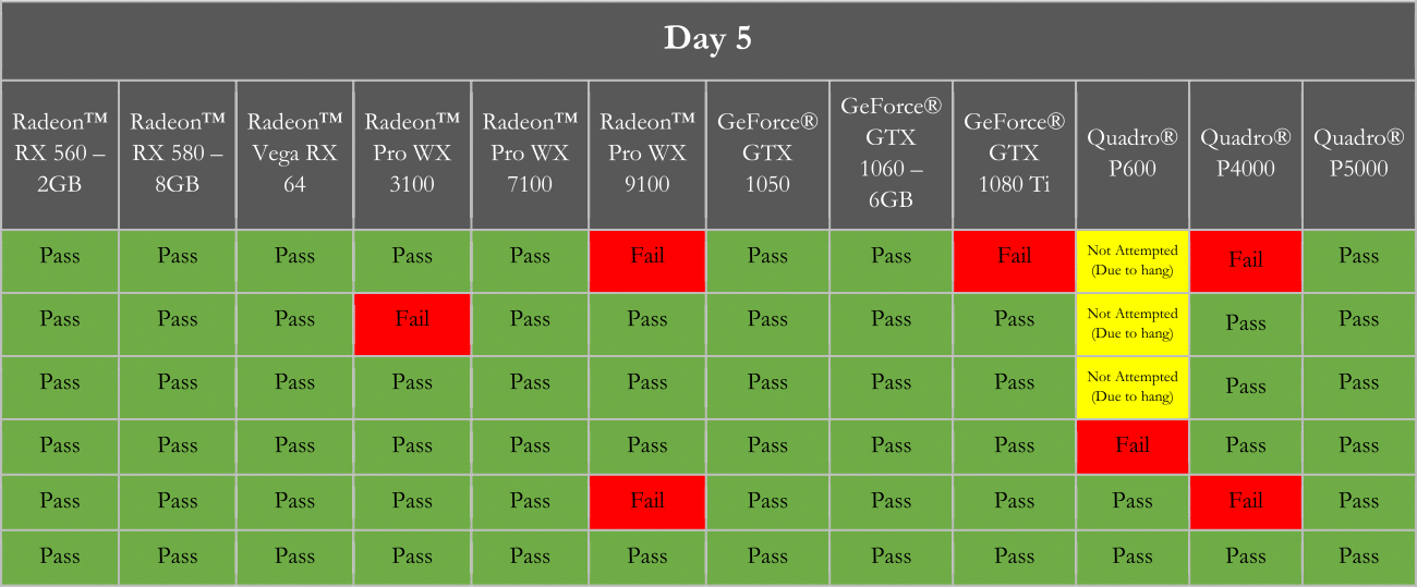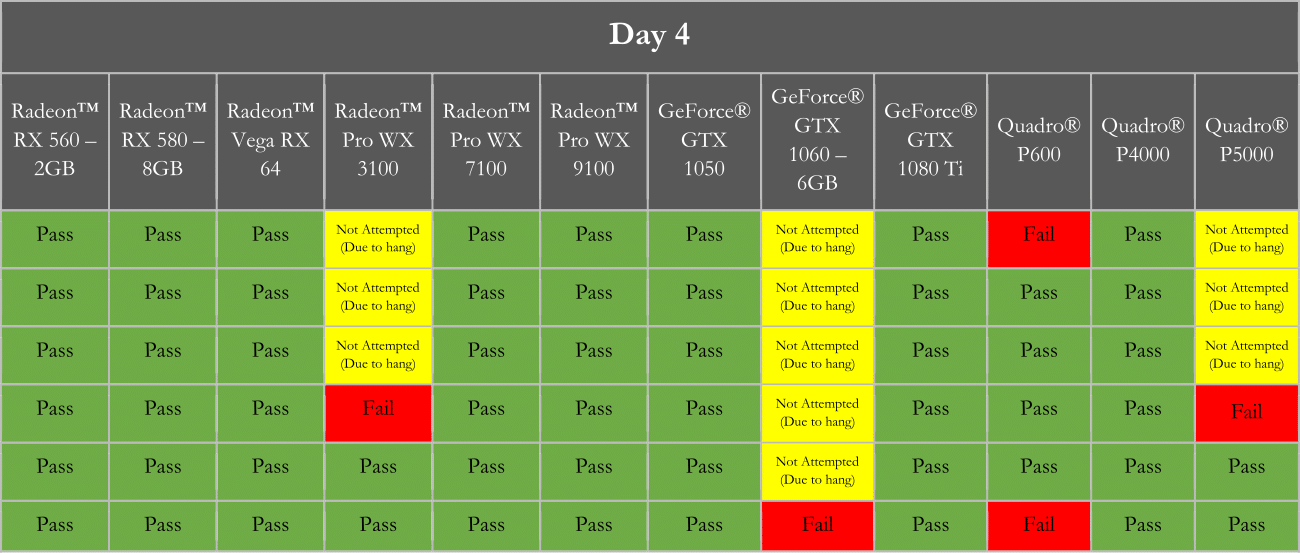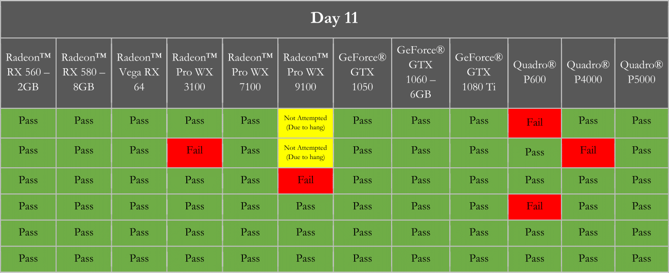 Každý systém s grafickou kartou byl podroben 72 testům (na kartách každého výrobce tedy proběhlo v souhrnu 432 testů). Testování bylo rozděleno na čtyřhodinové úseky, těch běželo šest denně (tzn. zátěž byla kontinuální) a test běžel po dvanáct dní. Testování nebylo zaměřeno pouze na samotnou zátěž ve 3D, ale také přepínání různých rozlišení, overlay, probrání / odpojení GPU a podobně.
