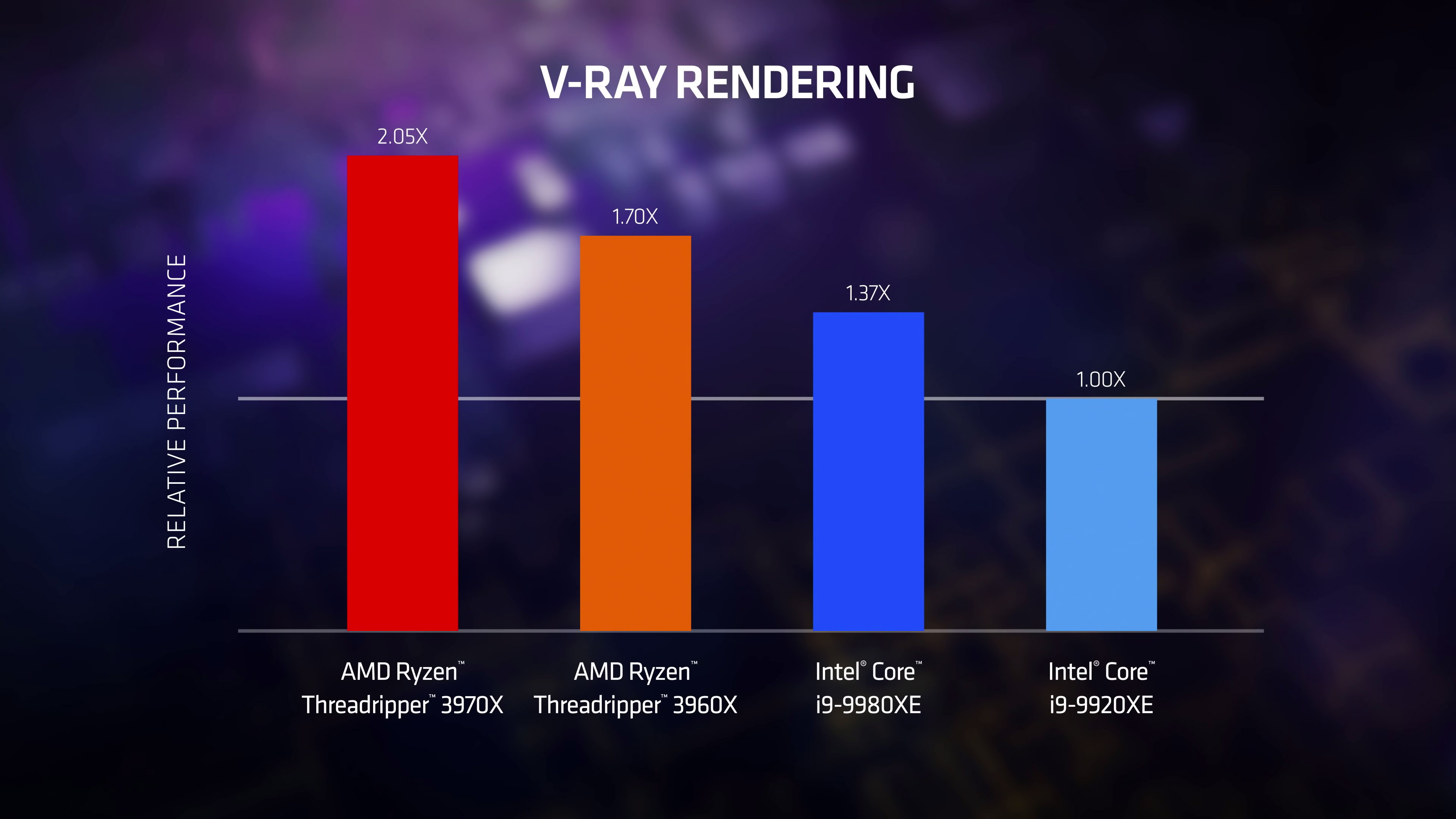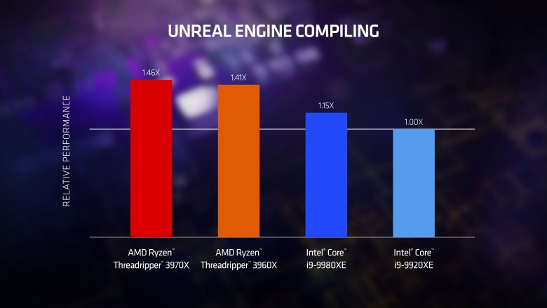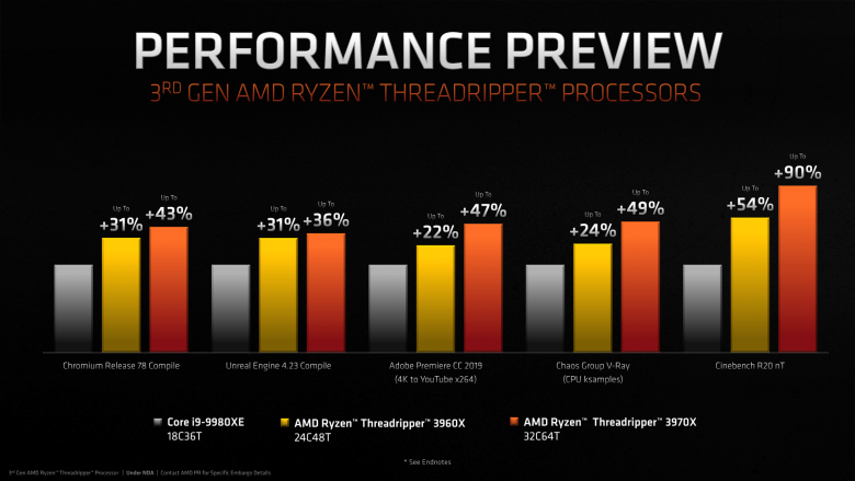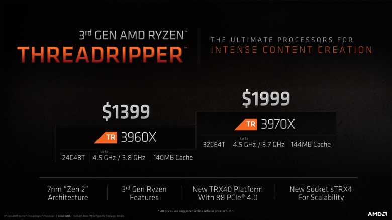 Pomineme-li dvoudenní posun oproti původnímu plánu, došlo podle očekávání k odhalení 24jádrového Threadripperu 3960X a 32jádrového Threadripperu 3970X. Předpokládané avízo Threadripperu 3990X ale nepřišlo, ač ho podle starších uniklých slajdů AMD původně plánovala. 24- a 32jádrový model disponují základním taktem 3,8 a 3,7 GHz, oba mají shodný 4,5GHz boost, 128 MB L3 cache a 280W TDP. Oficiální cena prvního jest $1399, druhého $1999.