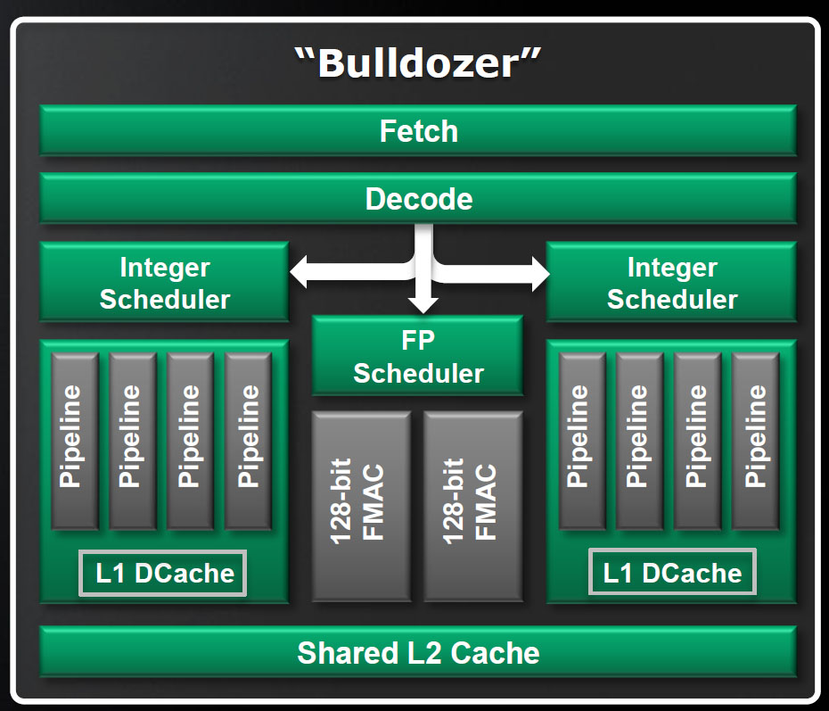 Bulldozer fyzicky obsahuje osm INT jednotek a čtyři FPU, což je patrně důvod, pro který se Dickey domnívá, že nejde o osmijádrový procesor. Jako jádro (core) je ovšem v souladu s historickým vývojem chápána celočíselná (INT) jednotka. Existuje řada starších jednojádrových x86 procesorů bez FPU (386 a starší, 486SX), existují vícejádrové ARM procesory bez FPU (např. ARMv6 používané v telefonech), v roce 2005 uvedl Sun osmijádrový UltraSPARC T1, který nese jedinou FPU. FPU totiž není chápána jako jádro, ale jako koprocesor - v průběhu historie integrovaný do základního procesoru. Nakonec kupříkladu Nvidia používá termín CUDA jádro (CUDA core) jako označení pro stream-procesory grafických čipů.