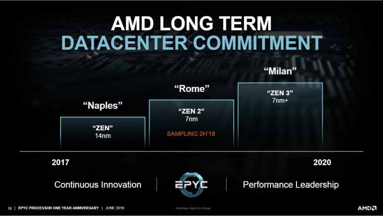 Za pozornost stojí i výhled. Na příští rok AMD chystá druhou generaci EPYCu, platformu Rome, která bude postavena na 7nm čipech architektury Zen 2. AMD má v současnosti už tyto čipy v laboratořích a šéf serverové divize Forrest Norrod vyjádřil nebývalou radost nad jejich stavem a výsledky. Přislíbil, že ve druhé polovině roku (konkrétně použil termín „brzy“, takže tím asi nebude míněno mezi Vánoci a Novým rokem) zahájí distribuci vzorků partnerům. Navíc se na tuto generaci velmi těší, protože půjde o historicky vůbec první okamžik, kdy bude mít AMD na trhu serverové procesory vyráběné na procesu plně srovnatelném s procesem, na němž budou vyráběné produkty Intelu. Řeč je konkrétně o 7nm procesu GlobalFoundries a 10nm procesu Intelu.