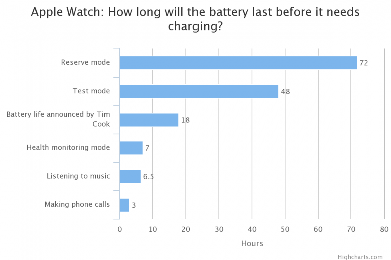 Výdrž Apple Watch na jedno nabití nedosahuje ani jednoho dne - výrobce uvádí 18 hodin při „typickém“ použit. 18 hodin je dosaženo, pokud není čas kontrolován více než 5× za hodinu, nedojde na více než 90 notifikací, aplikace budou využívané maximálně po dobu 45 minut a hudba přes Bluetooth přehrávaná do 30 minut. Pokud jsou využívané funkce fitness, klesá výdrž na (méně než) 7 hodin, při vytrvalém poslechu hudby na 6,5 hodiny a při telefonování na 3 hodiny.