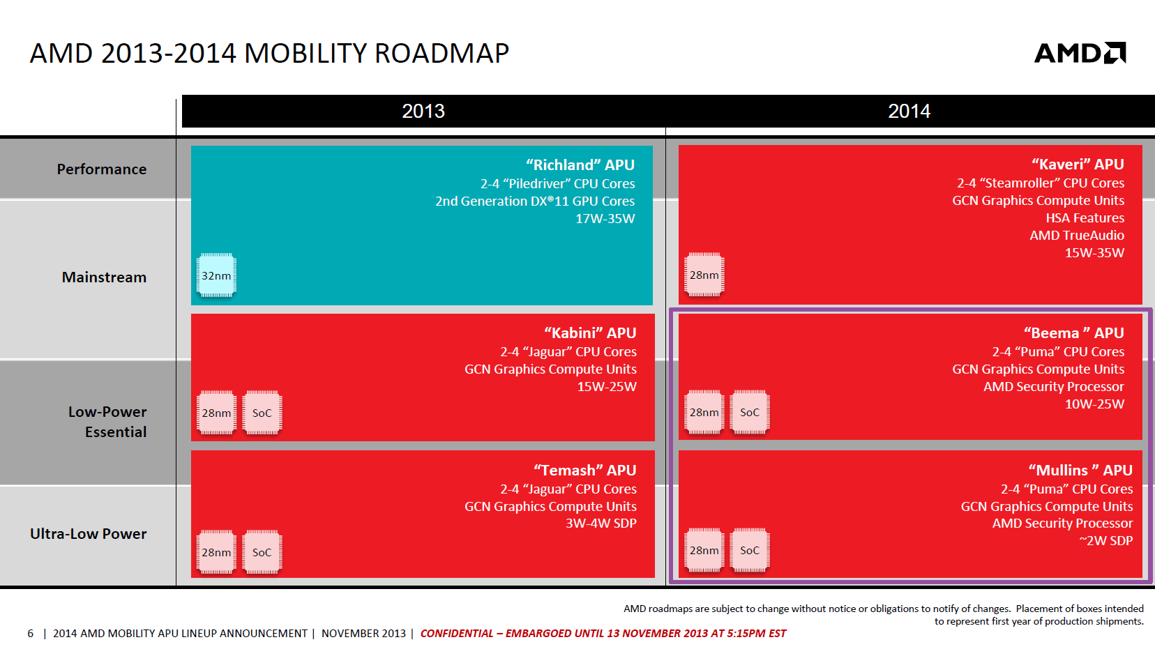 Pojďme si shrnout, co vlastně o čipech Beema a Mullins víme. Jde o přímé nástupce generace Kabini a Temash, low-power x86 čtyřjader určených primárně pro mobilní trhy. Obě vzniknou na 28nm výrobních linkách, jak máme potvrzeno již od loňského roku.