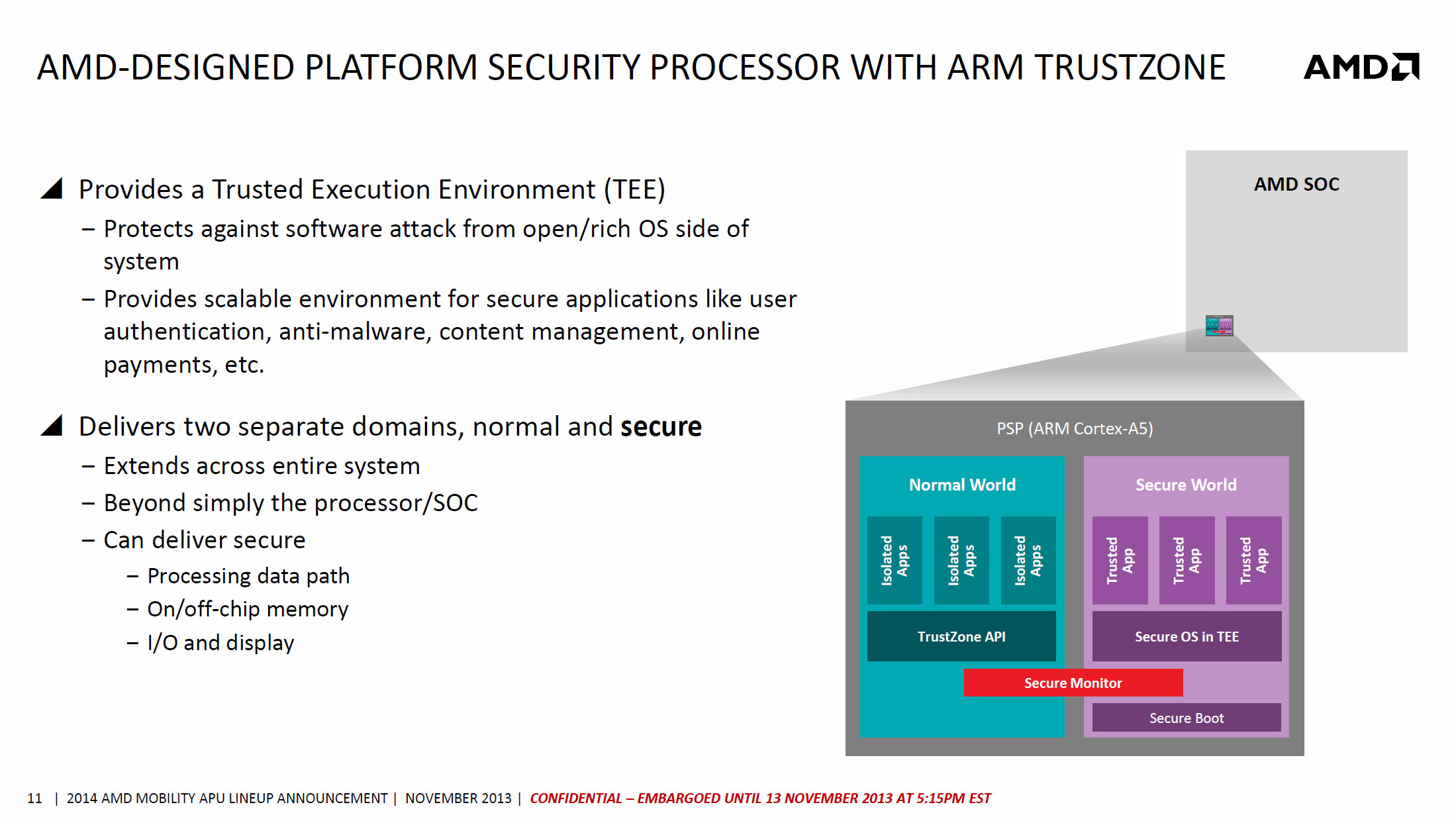 Poměrně podstatná informace, kterou výrobce zveřejnil loni v listopadu, souvisí s integrovaným tzv. „AMD Security Processor“, jehož úlohu zastává licencované jádro ARM Cortex-A5. Loňská prezentace potvrdila také ~2× vyšší energetickou efektivitu (výkon na watt), což koresponduje s očekávanou implementací turba a optimalizacemi pro snížení spotřeby.