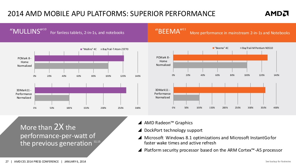 Krom distribuce výrobcům a vydání v tomto kvartálu se Su pochlubila několika menšími úspěchy: AMD věří, že se jí s novou generací APU, především SoC Beema, podaří dosáhnout výraznějších úspěchů než s Kabini. Společnost dokázala oslovit řadu výrobců mobilních zařízení, kteří by měli novinky uvést ve druhém kvartálu; širší spektrum ~booků pak bude na trhu ve druhé polovině roku.