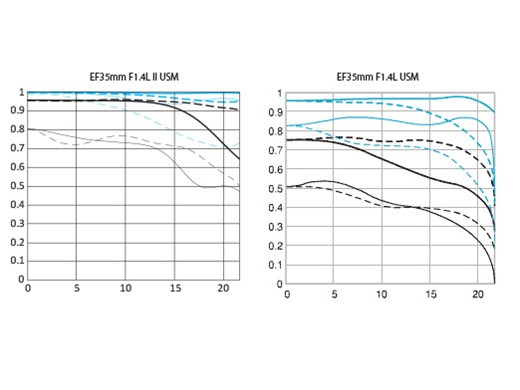 Canon poskytl srovnání MTF křivek nového a starého modelu - rozdíl je obrovský. I když nelze křivky srovnávat navzájem mezi výrobci (různé metody měření mohou dát odlišnější výsledky pro jeden objektiv než jaké se naměří jednou metodou u dvou různých objektivů), zdá se, že Canon dokáže překonat Sigmu, která byla až dosud v první linii (maximálně dotažena novým Distagonem 35mm f/1.4 pro Sony bajonet). O konkurenci těchto produktů lze hovořit ale jen dokud nehodnotíme cenu: