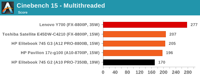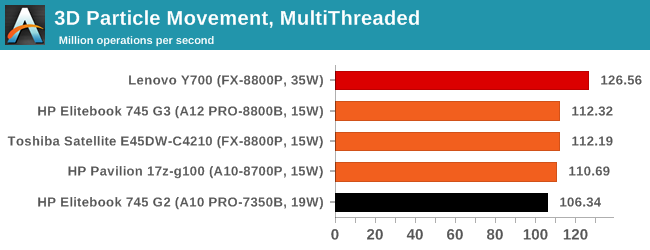 Jenže - jak upozornila redakce webu Anandtech - situace se trochu zkomplikovala. Závod 19W Kaveri a 15W Carriza připomíná závod staršího a novějšího terénního automobilu v rychlostní jízdě do kopce, při které má ten novější zataženou ruční brzdu. V případě APU je onou brzdou fakt, že ať vyberete jakýkoli základní model notebooku s Carrizo (Anandtech se podíval na HP Elitebook 745 G3, Toshiba Satellite E45DW-C4210, HP Pavilion 17z-g100 a Lenovo Y700), mají paměti osazené v jednokanálové konfiguraci. V praxi to znamená, že namísto datové propustnosti 25,6 GB/s (notebooky s Kaveri) má grafické jádro s procesorem dohromady k dispozici jen 12,8 GB/s (notebooky s Carrizo).