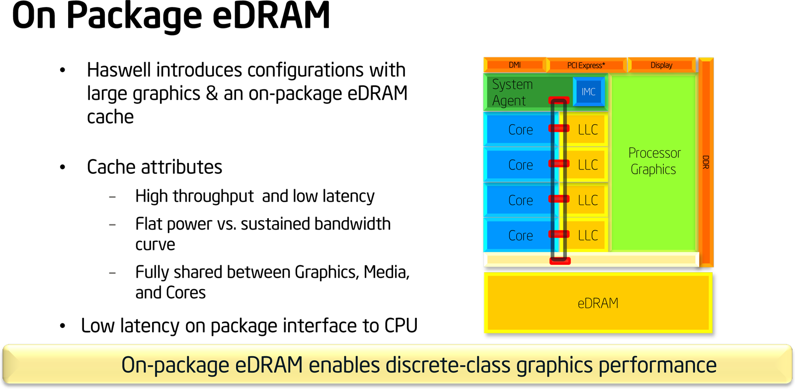První podmínka byl zásadní problém. Integrované grafiky Intelu nebyly pomalé proto, že by byly limitované datovou propustností, ale proto, že samy o sobě nedosahovaly vysokého výkonu. SLC - ať už v podobě sdílené L3 nebo v podobě eDRAM (L4) - jim nemohla zásadně pomoci.