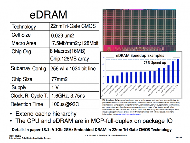 Ani latence eDRAM Intelu nebyly kdovíjaké terno - oproti L3 byly 3-6× vyšší, oproti latencím DDR3 pamětí jen o desítky procent nižší. Pokud z této SLC procesor nějakým způsobem těžil, bylo to především díky její vysoké kapacitě (128 MB).