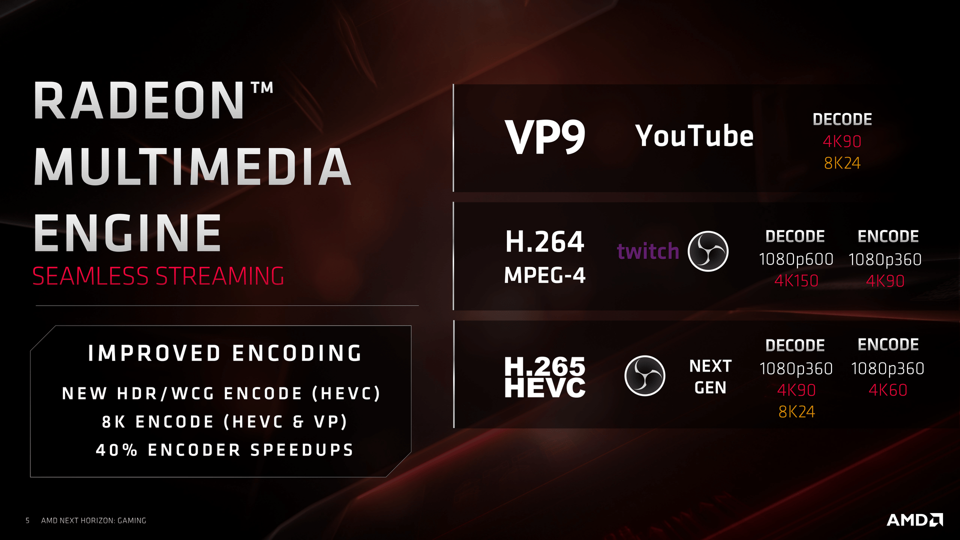 Sáhněme do jiného soudku - multimédiálního. Výbava pro video dosáhla značného vylepšení. Enkodér je o 40 % rychlejší, takže je možné hardwarově komprimovat 1080p při až 360 FPS a to jak pro H.264, tak H.265. 4k rozlišení zvládá Navi komprimovat do H.265 při 60 FPS, do H.264 při 90 FPS. Rychlost dekódování je oproti těmto číslům většinou více než o polovinu vyšší. Novinkou je přehrávání 8K při 24 FPS (pro H.265 a HEVC).