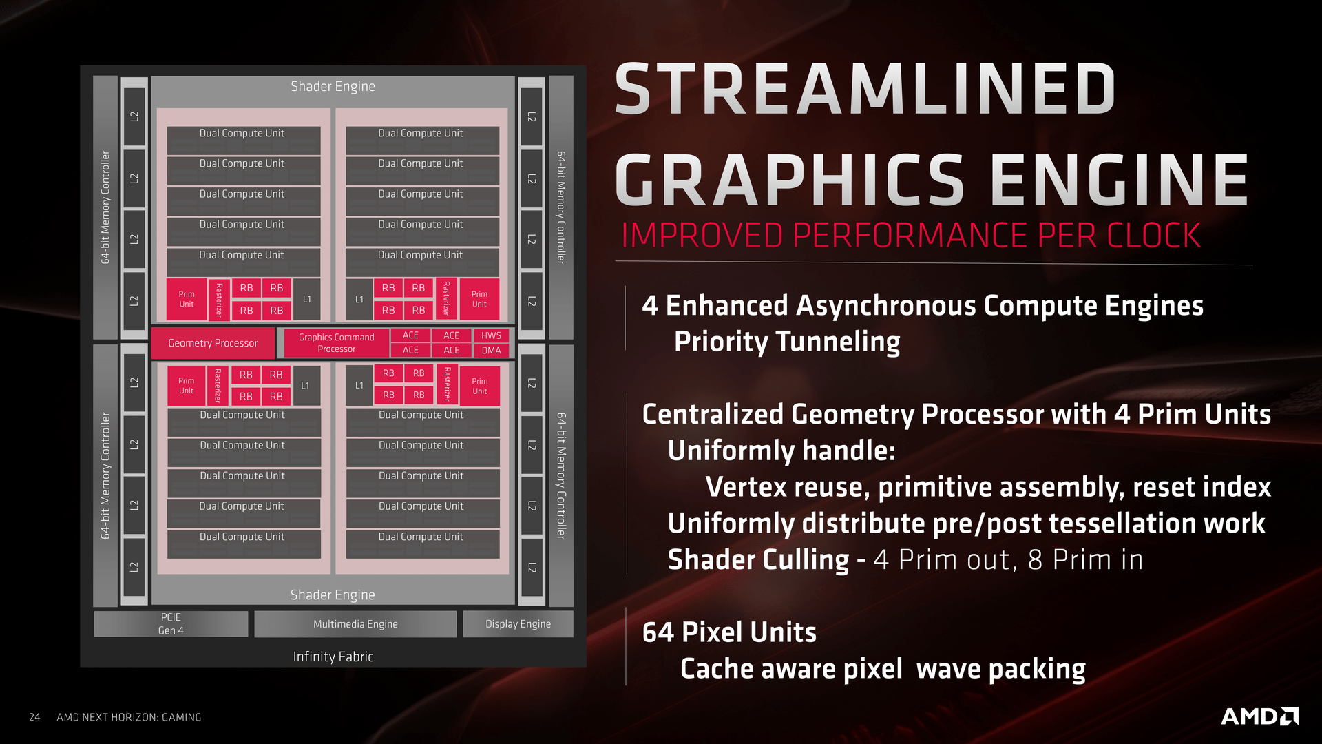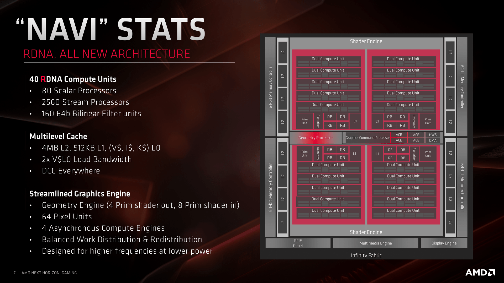 Při prvním pohledu na diagram jádra je patrné, že většina „zaručených zpráv“ o této architektuře neměla s realitou mnoho společného. Jádro, fyzicky nesoucí 2560 stream-procesorů, 160 texturovacích jednotek a 64 ROP, je uspořádáno odlišně, než jsme byli u všech dosavadních čipů řady GCN zvyklí. Staví na Compute Units o 64 stream-procesorech a čtyřech texturovacích jednotkách, takže základní idea zůstává, ale přináší řadu změn ve všech ohledech. Jádro se dělí na dvojici segmentů nazvaných Shader Engine. Každý Shader Engine integruje dvojici identických bloků (vyznačených červeně), které obsahují 5× Dual Compute Unit, jednotku pro zpracování polygonů, rasterizér, 16 ROP jednotek a L1 cache.