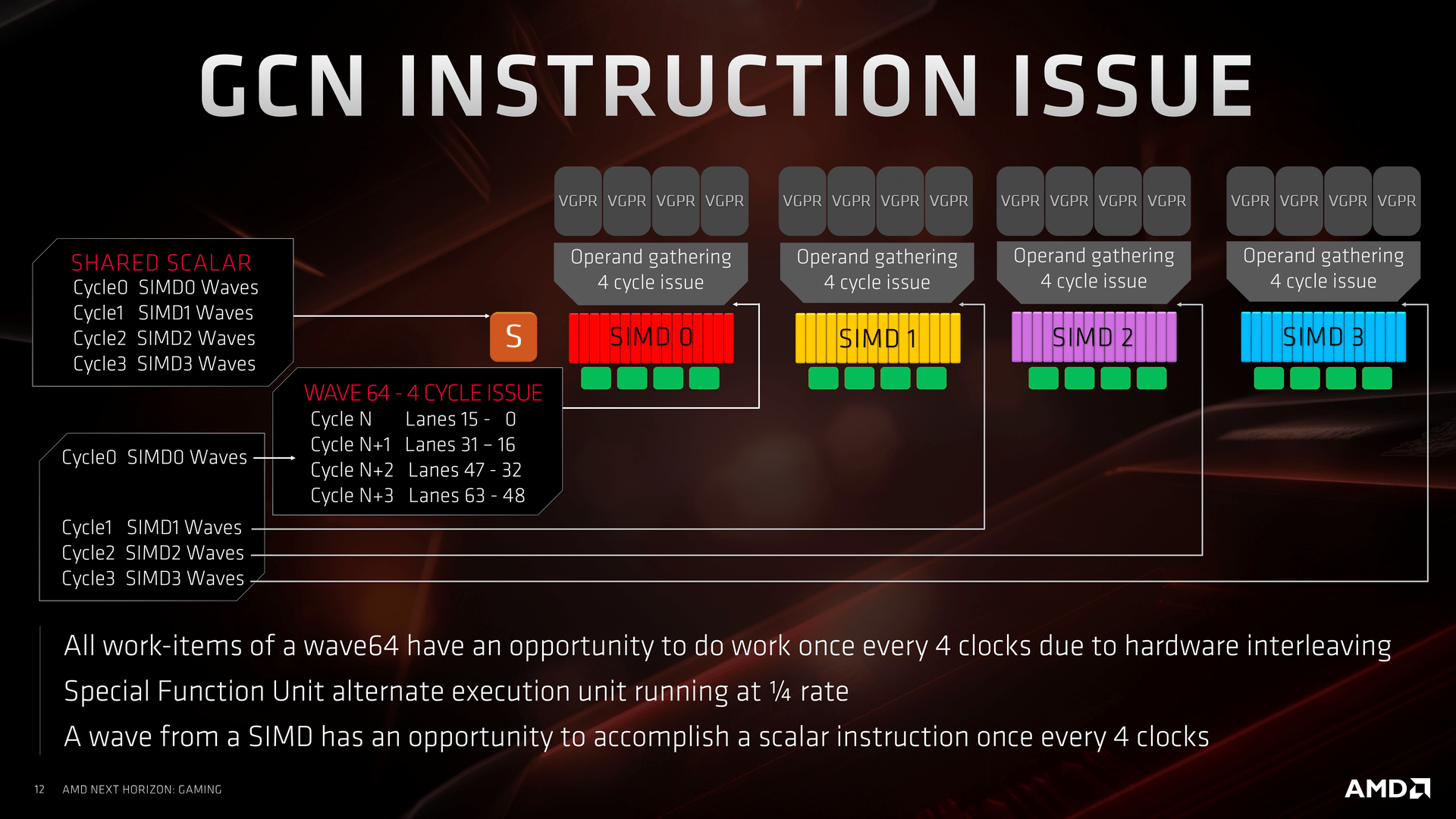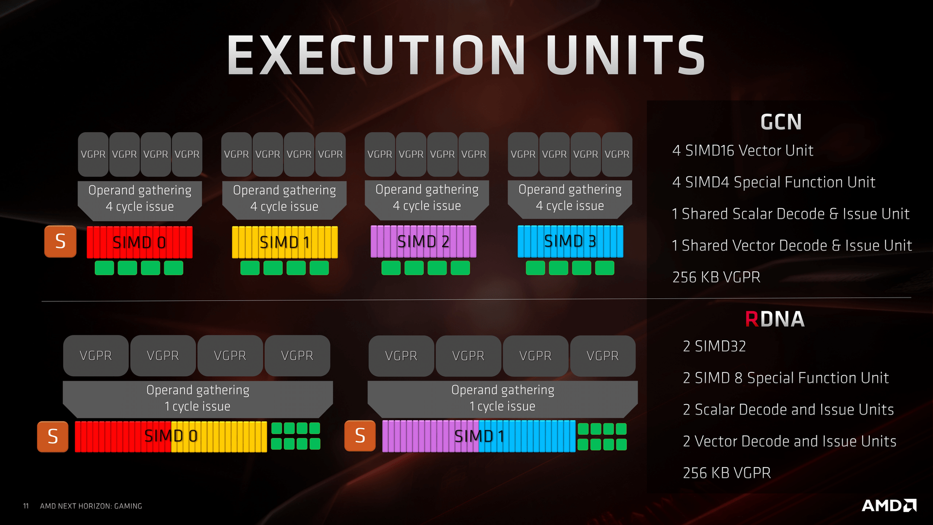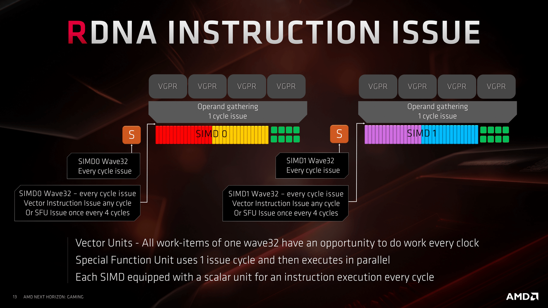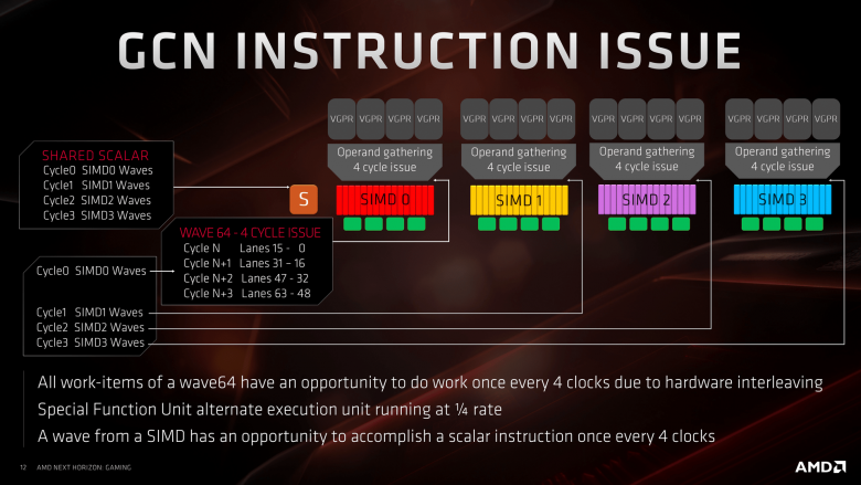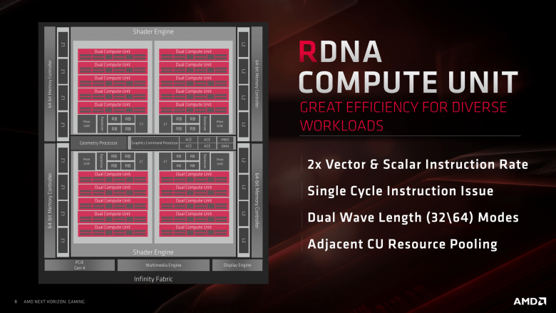 Druhá klíčová změna, která s tím přímo souvisí, je možnost postoupení wavefront v jediném taktu namísto čtyř u GCN. Třetí výrazná změna se týká dvou skalárních jednotek na Compute Unit (namísto jedné u GCN) a čtvrtá uspořádání Compute Units po dvojicích. Výhoda spočívá mimo jiné v tom, že dvě Compute Units mohou mít jednu společnou větší cache, což je v některých situacích výhodnější než dvě poloviční oddělené cache pro každou zvlášť. Za páté, instrukční rychlost se oproti GCN zdvojnásobila.