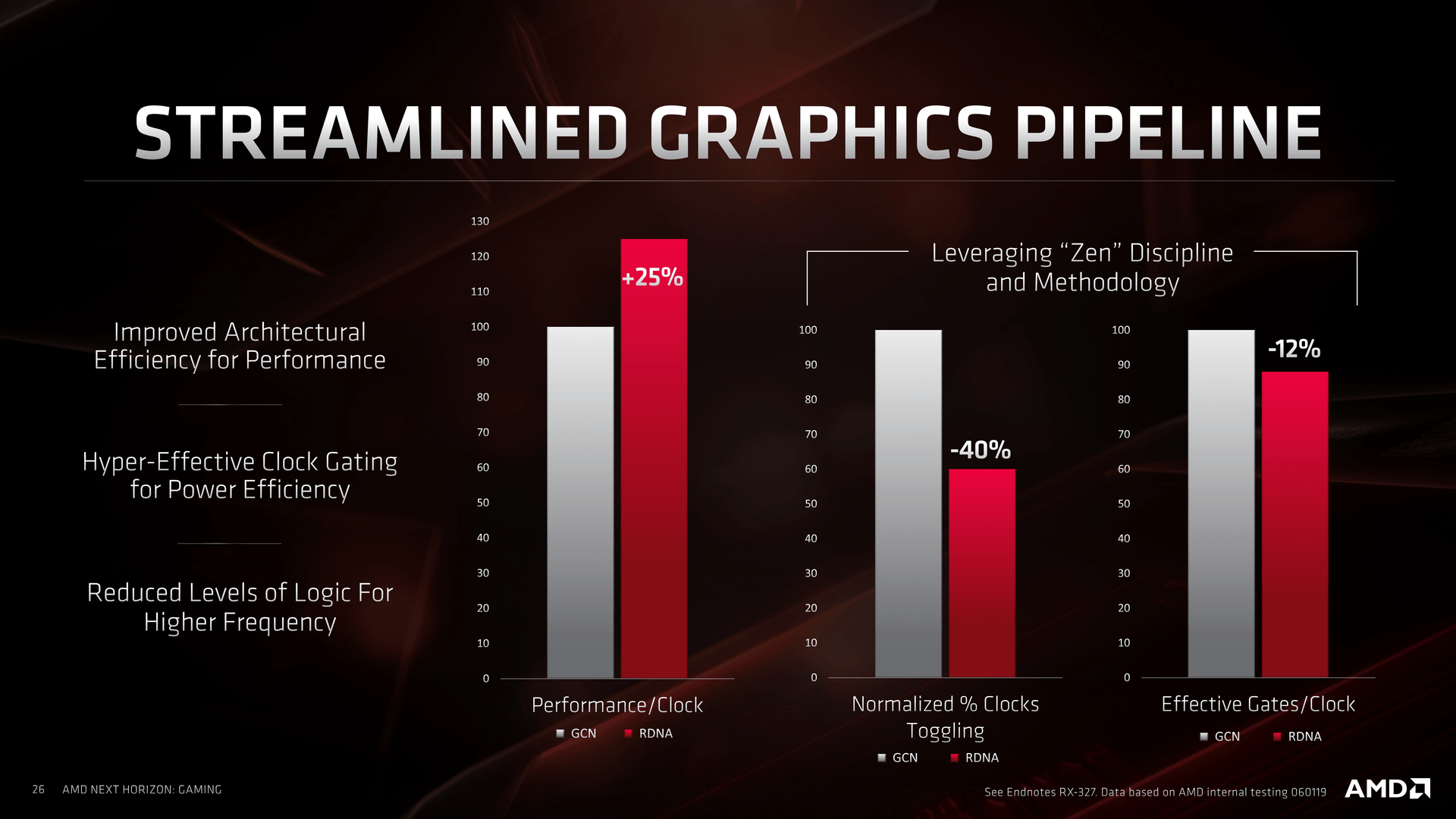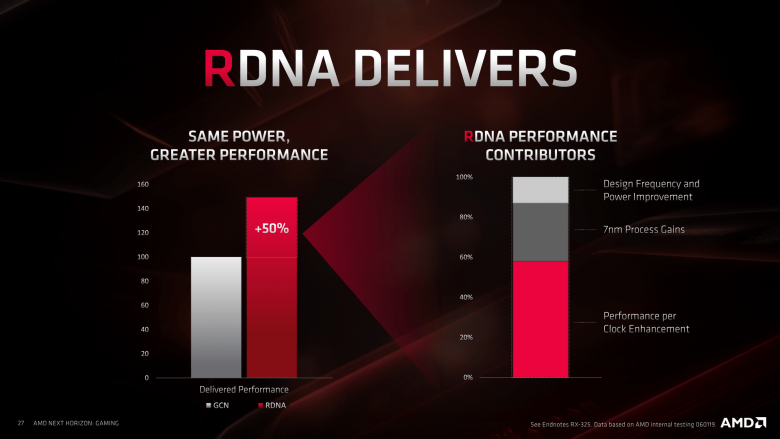 Oproti Radeonu RX Vega 64 je energetická efektivita Navi zhruba o 50 % vyšší. Z této poloviny navíc jde podle AMD přibližně 60 % na vrub zvýšeného IPC, kolem 25 % na výrobní proces a asi 15 % lepší optimalizaci návrhu. V praxi nabídne Radeon RX 5700 XT oproti Radeonu RX Vega 64 o 14 % vyšší výkon při o 23 % nižší spotřebě, což (1,14/0,77 = 1,48) odpovídá onomu ~50 % posunu.