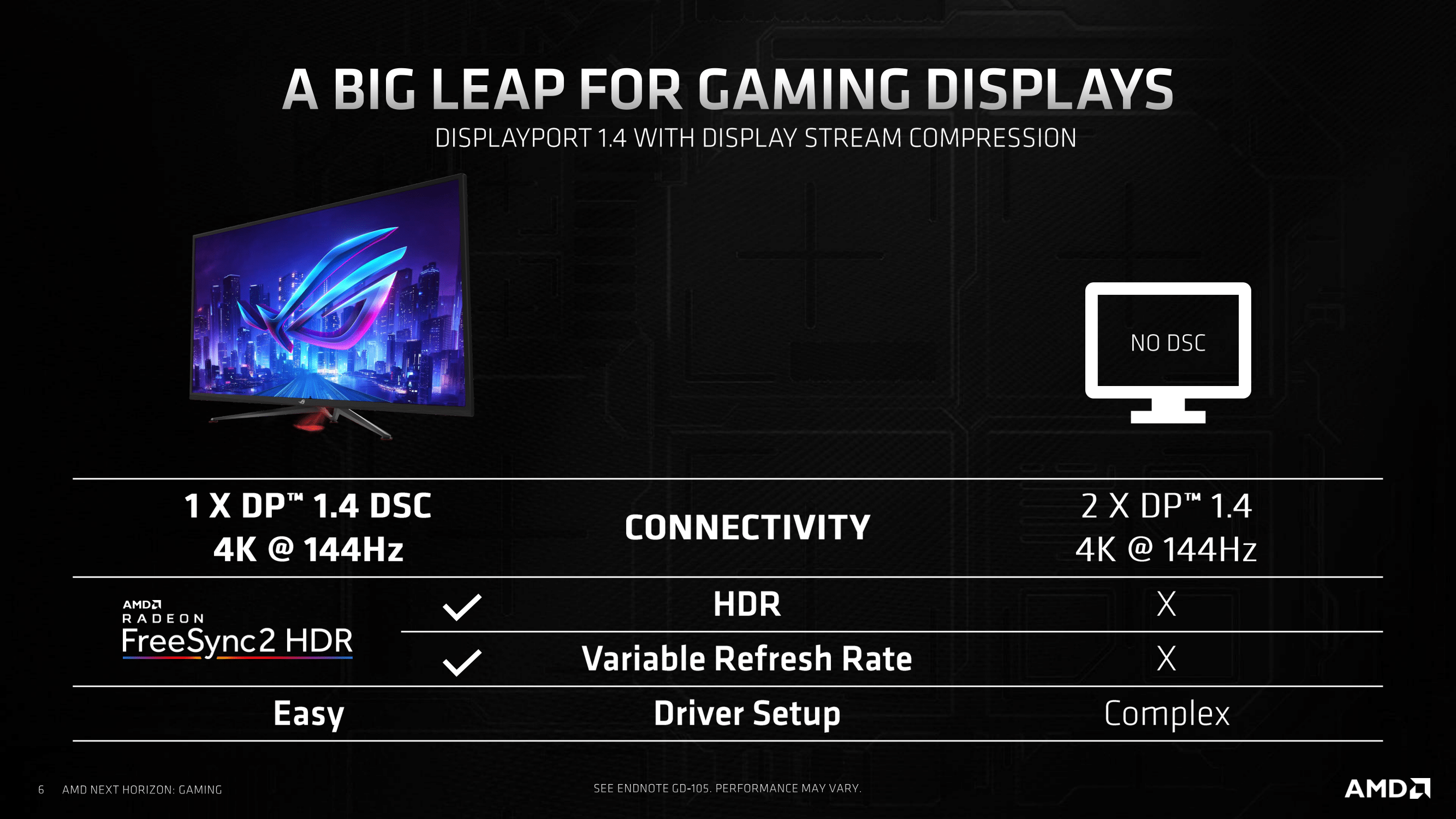 Nvidia to u současného hardwaru řeší barevným podvzorkováním (snížením barevného rozlišení na polovinu), což má negativní dopad na obrazovou kvalitu. S využitím DSC komprese se lze degradaci barevného rozlišení vyhnout a dosahovat vysokých obnovovacích frekvencí i na panelech s vysokým rozlišením.
