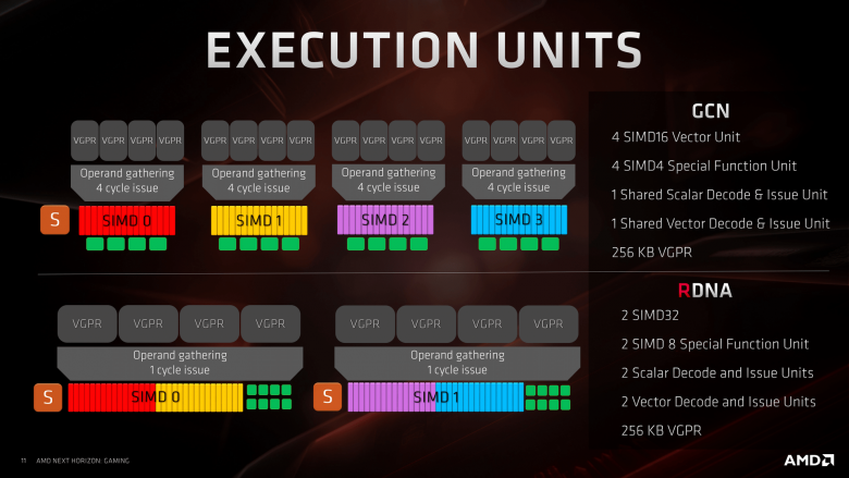 Vraťme se k výpočetnímu jádru, na jehož úrovni se odehrály velké změny. Lze je považovat za největší od nasazení GCN nebo výraznější než mezi některými architektonickými generacemi Nvidie. První klíčovou novinkou, kterou se RDNA liší od GCN, je schopnost zpracovávat úlohy po 32 vláknech namísto po 64 u GCN. Přesněji řečeno, RNDA může volit, zda bude wavefront dosahovat 32 vláken nebo 64, ale první hodnota je chápána jako nativní. Nikoli bezdůvodně. SIMD byl rozšířen ze 16 slotů na 32, takže wavefront se 32 vlákny odpovídá hardwarové konfiguraci 32 slotů, což zvyšuje efektivitu jejich využití.