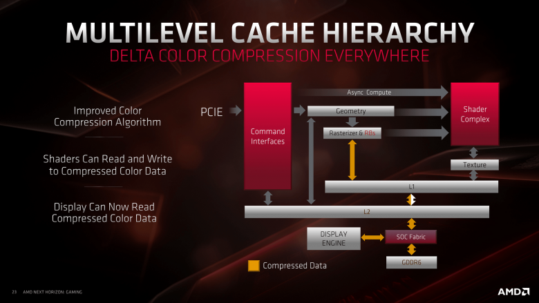Pokud jde o efektivnější datové přenosy, přispívá jim krom nové struktury cache také vylepšený algoritmus delta komprese, která je s Navi / RDNA podporována i na úrovni všech podstatných prvků uvnitř čipu, takže data proudí i uvnitř čipu komprimovaně. Vylepšení algoritmu delta komprese je v podstatě jediný zveřejněný prvek, který má potenciál snížit nároky na propustnost paměťové sběrnice. Což stojí za pozornost vzhledem k tomu, že z takové úpravy nelze již příliš získat (jde v podstatě o čtvrtou generaci delta komprese na hardwaru AMD) a přitom je Navi schopna dosahovat až 90 % výkonu Radeonu VII při 44 % jeho paměťové propustnosti. Buďto se nějakými změnami souvisejícími s využitím sběrnice AMD nepochlubila, nebo zkrátka Vega nebyla co do paměťové propustnosti tak neefektivní, jak se tvrdilo, jako spíš vybavená vyšší datovou propustností, než bezpodmínečně potřebovala.