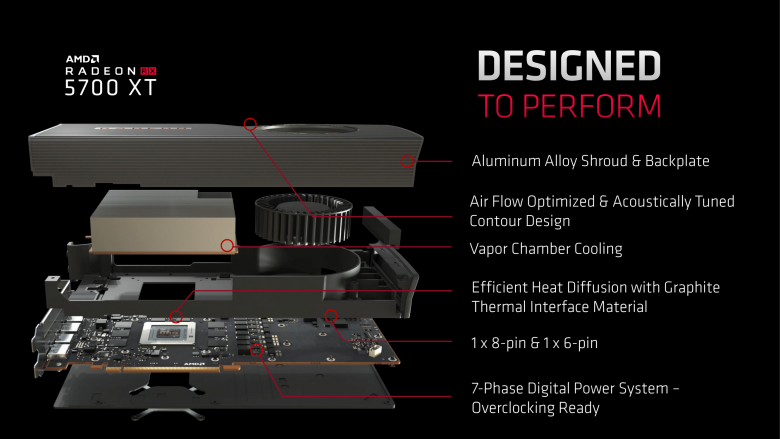 Referenční Radeon RX 5700 XT nabídne odstředivý chladič, který však na rozdíl od chladiče Polaris nesází na hliníkový pasivek s měděným jádrem, ale masivní měděnou vapor chamber rozvádějící teplo od jádra k lamelám chladiče.