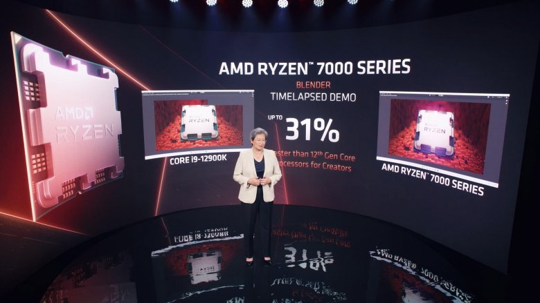 Při Computexu totiž Lisa Su demonstrovala, že Zen 4 stačí pro zpracování úlohy v Blenderu o 31 % kratší čas než Alder Lake, jinými slovy (1 / 0,69 =) o 45 % vyšší výkon šestnáctijádrového Zen 4 oproti Alder Lake. Právě o těchto „více než čtyřiceti procentech“ mohl Hallock hovořit.