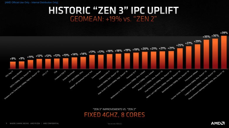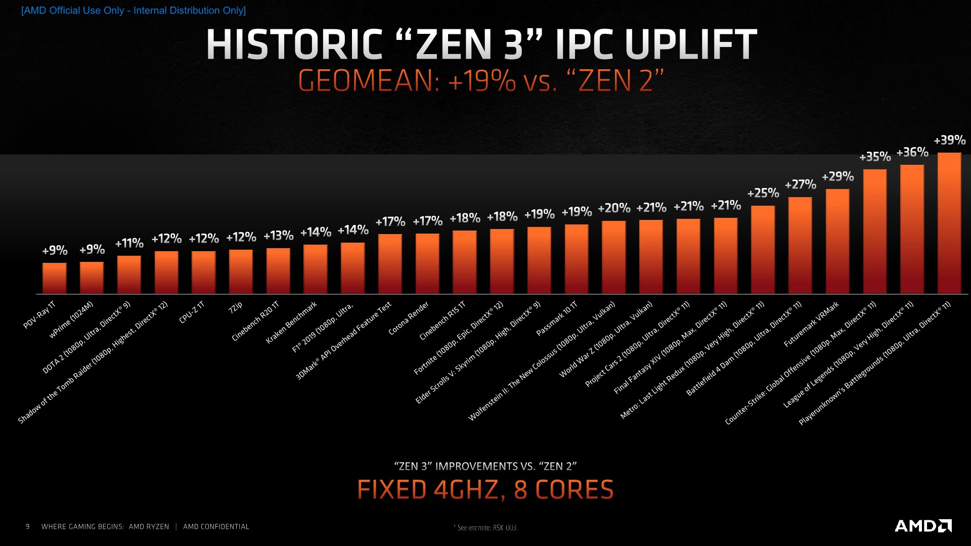 …a nejspíš hned tak nepřestane. Někteří uživatelé si totiž nepřipouštějí, že stejně jako každou generaci tvoří řada modelů, tak i vydání každé generace předchází vznik řady různě konfigurovaných vzorků. A když existuje řada vzorků, tak lze i různé testy provádět na různých vzorcích. Když tedy AMD oznámila, že na jednom vzorku dosáhla v jednojádrové zátěži v jednom testu (CineBench) o >15 % vyššího výkonu než na Zen 3, automaticky si tito uživatelé výsledek spojili s demonstrací až 5,52GHz taktovací frekvence v herní zátěži a předpokládají, že CineBench proběhl na stejné sestavě, stejném vzorku a stejném nastavení taktů jako herní demo. A tedy že když CineBench běžel na 5,52 GHz (a současný Ryzen 9 5950X dosahuje 4,9 GHz), tak se oněch 15 % navíc dělí na 13 %, za které mohou taktovací frekvence a 2 %, za které může nárůst IPC.