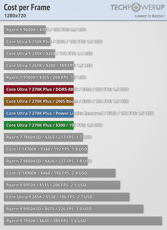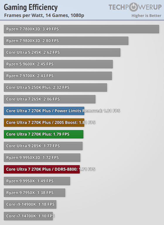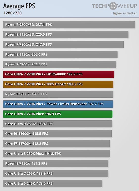 Podle TechPowerUp dosahuje Core Ultra 7 270K+ (výchozí konfigurace v grafu zeleně) průměrných FPS prakticky stejných jako původní Core Ultra 9 285K. Ryzen 9000 zůstává mírně rychlejší, tři roky starý Ryzen 7800X3D si drží 10% náskok a Ryzen 9000X3D zůstávají na vrcholu.