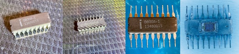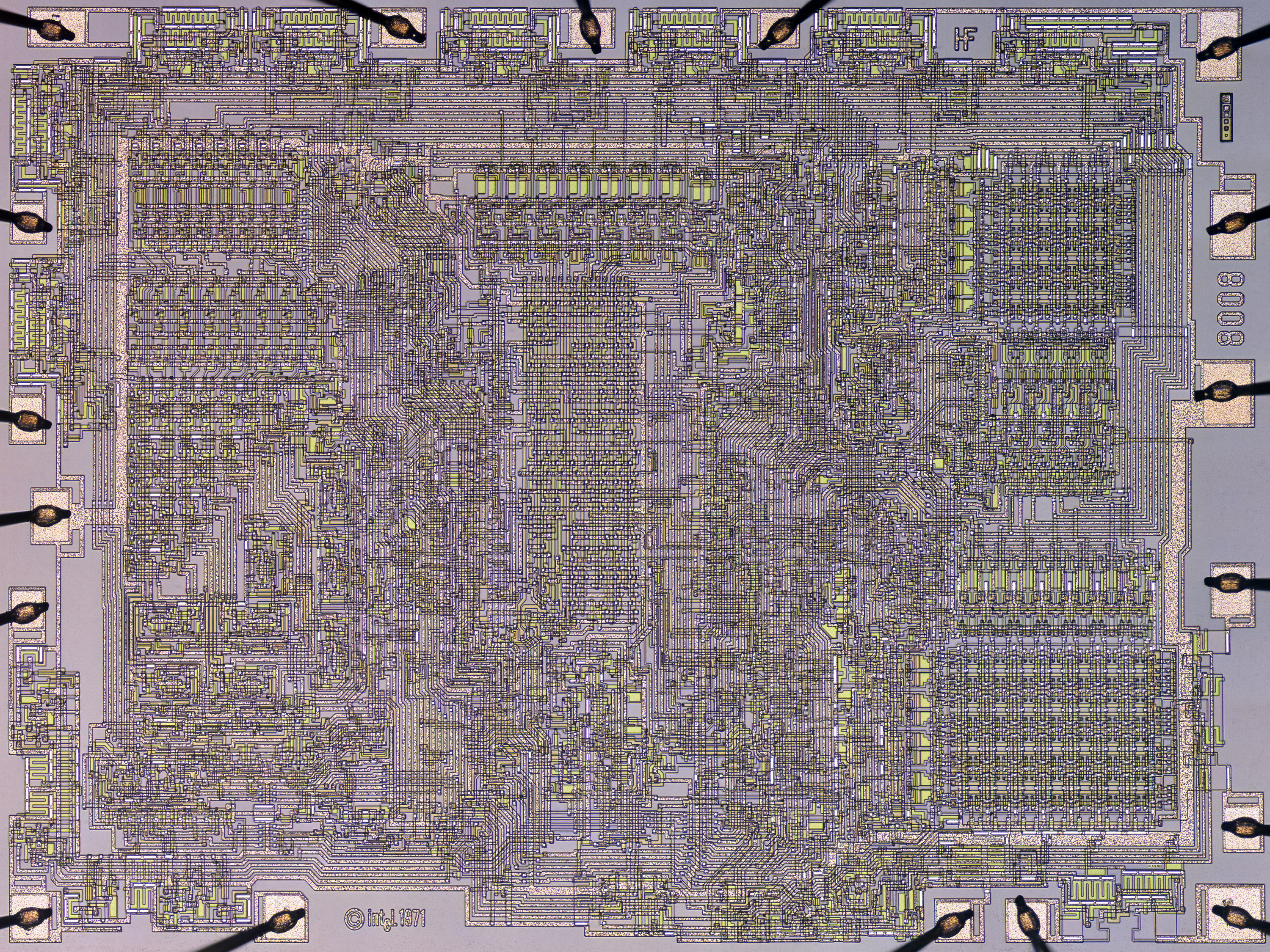 Výsledek vidíte výše. Za pozornost stojí nápisy „Intel 1971“, „8008“ a „HF“ (předpokládá se, že jde o iniciály Hala Freenyho z týmu) a především skutečnost, že se zbytkem systému je procesorové jádro propojeno všeho všudy 18 vodiči. Tedy o dva řády nižším počtem, než jsme zvyklí v současnosti (AM5 má 1718 pinů, socket pro Raptor Lake 1700 pinů a Arrow Lake 1851 pinů).