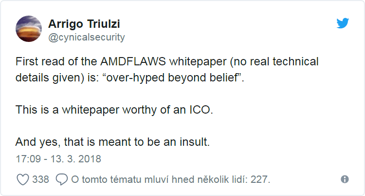 To je ostatně jasné i ze zmíněné prezentace, která je koncipovaná značně nelichotivým stylem. O formulace jako „návrhy čipů třetích stran zamořené skrytými zadními vrátky“ a podobné tam rozhodně není nouze. Kdo podobné dílo financoval, není příliš jasné. V kontextu nedávné kauzy (kdy Google v rámci tzv. Project Zero odhalil bezpečnostní slabiny moderních procesorů), ze které AMD z výrobců procesorů vybruslila nejlépe, je ale zřejmé, že tento výsledek komusi nevyhovoval.