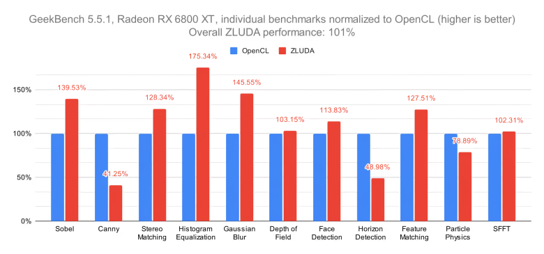 …i s Radeony RX 6000 lze pod ZLUDA dosáhnout lepších výsledků než v OpenCL, pro které je řada aplikací optimalizována spíše jen formálně. Z 11 dílčích testů GeekBench je dosahování v 8 případech vyššího výkonu pod ZLUDA a jen u 3 pod OpenCL.