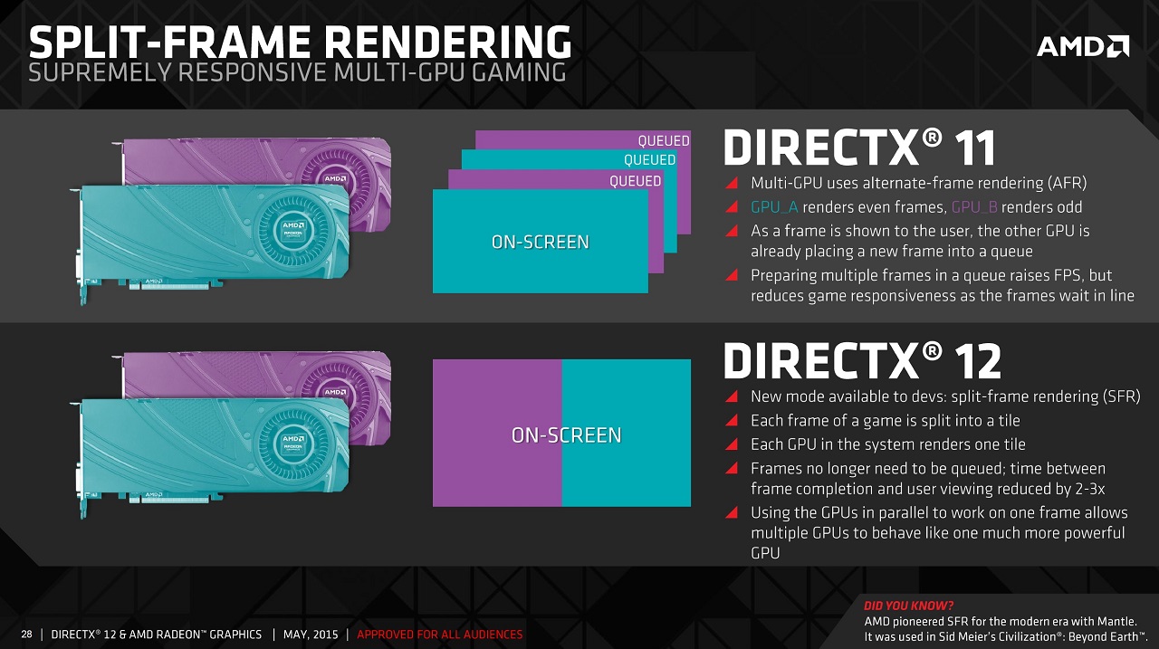 O druhé novince, split-frame rendering (SFR), jsme mluvili už v souvislosti s Mantle. Režim SFR se používal již v počátcích Nvidia SLI a ATi CrossFire před 10 lety, ale možnosti tehdejších API byly poměrně omezené na to, aby jej bylo lze využít efektivně. Podporované bylo pouze vodorovné rozdělení, a tak výrobce grafické karty musel řešit, zda s ohledem na různé nároky horní a dolní poloviny scény oželí trochu výkonu, nebo bude pro každou hru dělat vlastní profil (poměr, v jakém bude scéna rozdělena), nebo tento poměr odhadovat real-time na úkor procesorového výkonu. Nyní je možné i rozdělení svislé, při kterém je zátěž v drtivé většině případů rozložena efektivněji.