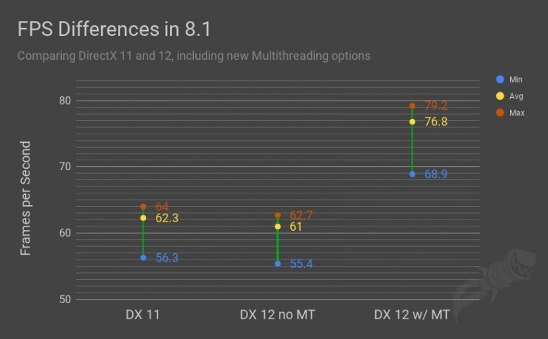 Situace se změnila s podzimem. World of Warcraft dostal vylepšení podpory DirectX 12, která spočívala především v implementaci tzv. multi-threaded renderingu. V této podobě nebyla podpora DirectX 12 již jen pouhým pozlátkem, výkon se skutečně posunul (byť ilustraci rozdílu najdete opět spíše v uživatelských diskuzích než recenzích, kterých je pomálu):