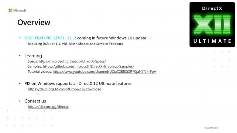 D3D_FEATURE_LEVEL_12_2 bude vyžadovat DXR (DirectX Raytracing) 1.1, VRS (Variable Rate Shading), Mesh Shader a Sampler Feedback. DirectX Raytracing 1.1 je v rámci DirectX novou generací, kterou Microsoft podle vlastních slov vyvinul ve spolupráci s AMD pro účely herní konzole Xbox.