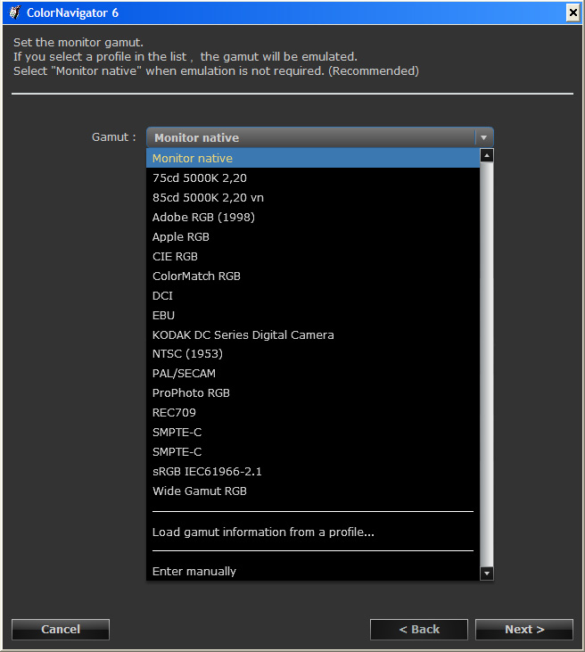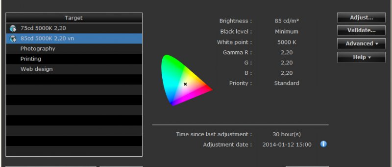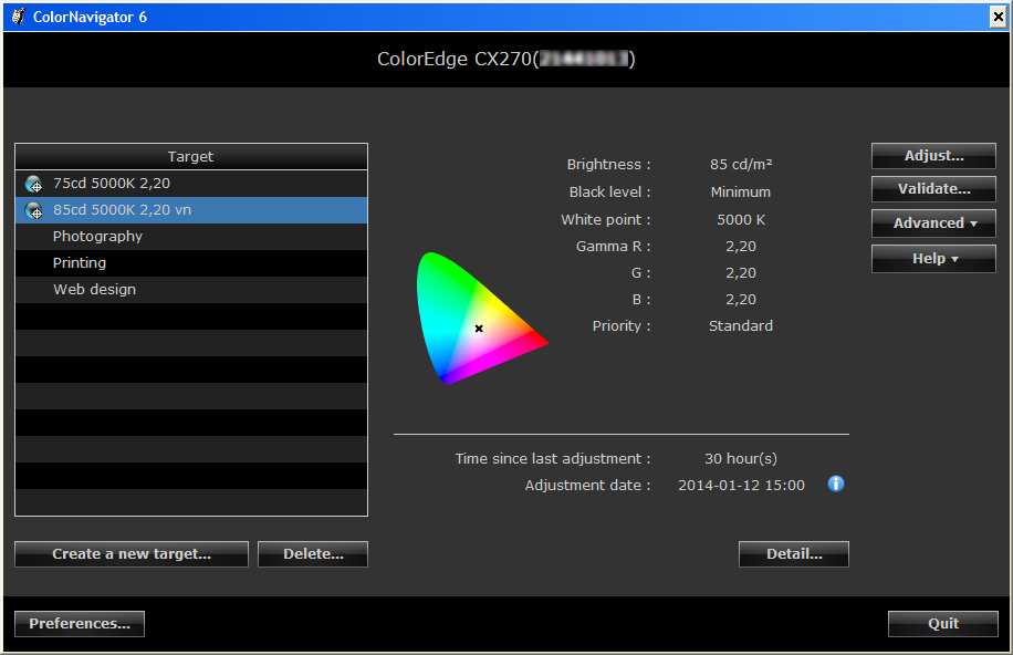 ColorNavigátor má sice už nějaké předvolby typické pro webdesign či fotografování, ale především umožňuje si vytvořit vlastní předvolby nastavení monitoru. Program se snaží uživateli stručně pomoci pragmatickým průvodcem vytvoření nové předvolby. Jako první se nastavuje cílový gamut (rozsah barev) monitoru. Můžete zde monitor donutit emulovat nejen celou škálu zařízení, ale i standardní barvové prostory, jako je třeba i sRGB či AdobeRGB. Já osobně doporučuji ponechat „Monitor native“ pro maximální využití barvových možností monitoru a bez ořezání jeho gamutu. Dále si můžete nastavit jas monitoru a cílovou gammu. Po zatržení volby „Extend the target brightness range“ se zobrazí doporučení EIZO, že by bylo nejlepší používat hodnoty jasu v rozmezí 60–120 cd/m2. Ovšem pokud si chcete z monitru udělat domácí velkoplošný reflektor, můžete si masochisticky nastavit jas až na maximálních 350 cd/m2 a při práci pak nosit nějaké moderní sluneční brýle… Pro profesionální fotografii a předtiskovou přípravu je vhodné (v závislosti na okolních světelných podmínkách) se pohybovat někde v rozumném rozmezí 75–100 cd/m2 (120 maximálně). Chromatickou teplotu bílé lze nastavit posuvníkem a nebo i numericky. Pak je možné nastavit úroveň černé (doporučuji ponechat na minimum a nic nezatrhávat). Dále je možné nastavit celkovou gammu (pro neznalé fajnšmekry dokonce i pro každý RGB kanál zvlášť). Téměř na konec si uživatel může vybrat, zda-li kalibrační algoritmus má při potřebných korekcích dát přednost maximálnímu vyvážení neutrální šedé, či maximálnímu kontrastu. Nejlepší volba je lehce kompromisní „Standard“, kdy algoritmus se snaží především dodržet neutrální šedou, při zachování co nejlepšího kontrastu. No a na konec si svou předvolbu můžete pojmenovat, uložit a nechat zkalibrovat. EIZO se snaží o maximální flexibilitu a nezávislost uživatele. U monitoru novějších modelů CG je v monitoru vestavěna kalibrační sonda — spektrální fotometr a přesto ColorNavigátor podporuje celou řadu externích kalibračních sond. Zde (jedná se přece o „odlehčenou a tedy i levnější verzi monitoru řady ColorEdge) je integrována jednodušší sonda, jenž sama o sobě neumožňuje úplnou kalibraci monitoru a tu lze provést jedině pomocí externí sondy (ColorNavigator podporuje 30 různých kalibračních kolorimetrů i spektrofotometrů). Během kalibrace se pak aktivuje interní sonda, jenž své měření porovnává s externí sondou a vytvoří si vlastní kompenzační tabulku, kterou si uloží do paměti monitoru. Po dokončení kalibrace se výsledek uloží (kompenzační matice kalibrace monitoru se uloží do interní paměti monitoru a barvový ICC profil monitoru se uloží do příslušné systémové složky operačního systému počítače). Pak je možné ještě provést kontrolu kalibrace monitoru pomocí funkce „Validace“.