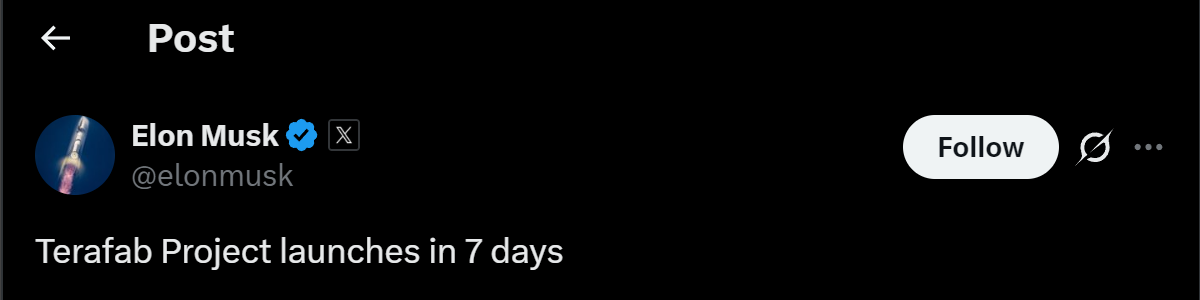 Elon Musk ohlásil spuštění projektu Terafab (Elon Musk @X/Twitter)