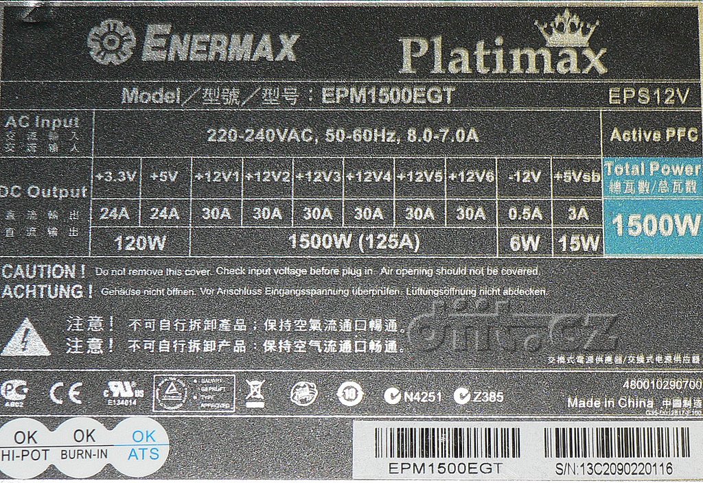 Platimax EPM1500EGT nabízí celkový výkon 1,5 kW, z toho 100 % na šesti větvích +12 V. Výkon ostatních větví je spíš tak aby se neřeklo, alespoň na +5 V SB to mohlo být víc, jak 15 W. Enermax se dušuje, že zdroj zvládně účinnost certifikovanou 80 PLUS Platinum při teplotě 50 °C. Akorát zapomněl říct, jak dlouho. V bitcoinovém mineru Bitmine CoinCraft Desk fungoval asi tři měsíce.