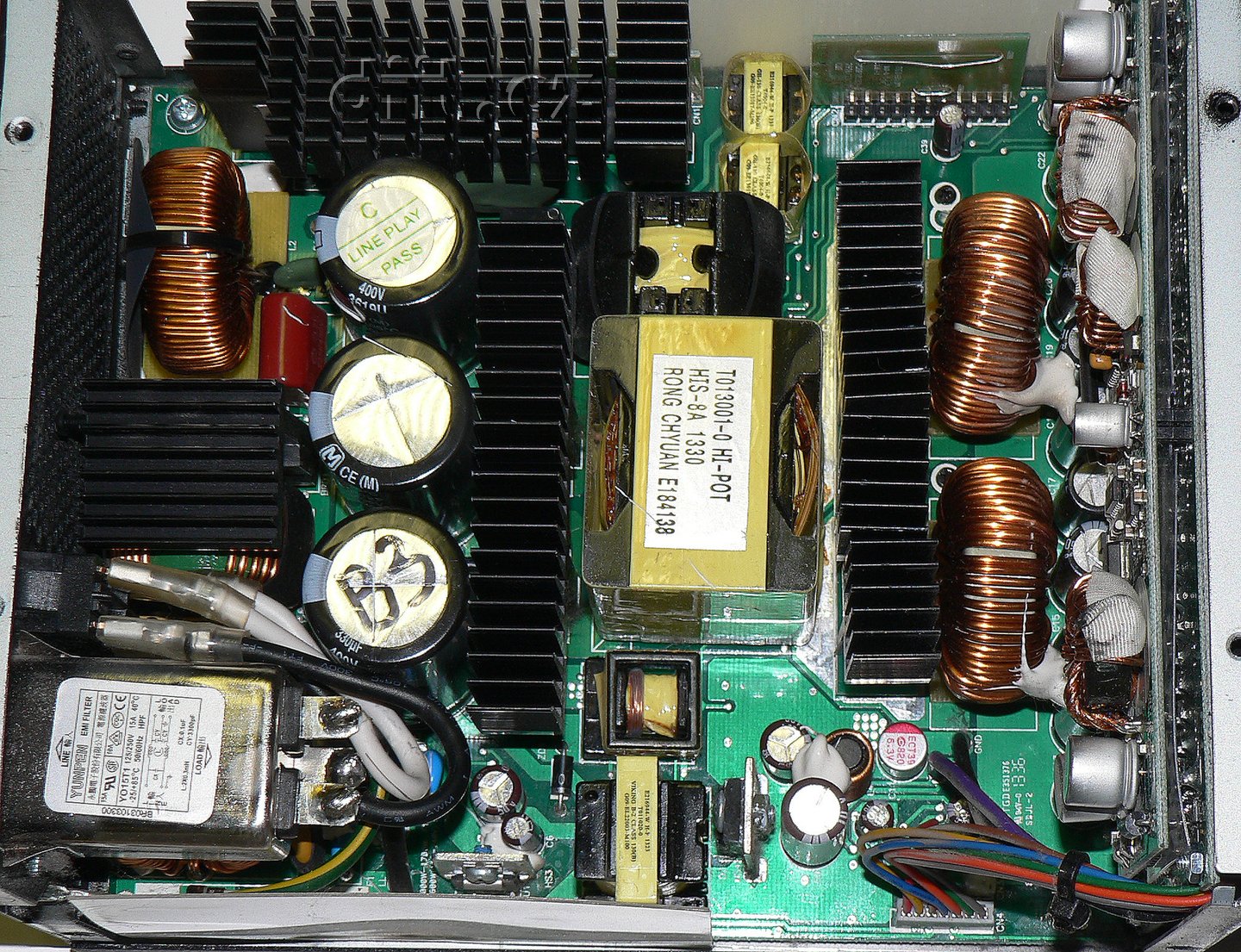 Zdroj sám o sobě není úplně špatný - má hezký vstupní filtr, spoustu převážně japonských kondenzátorů a vůbec. Tady není nic, co by vyloženě od pohledu mělo dělat problém. Koukněme se dál…