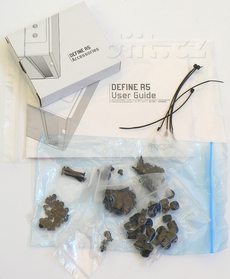 Obsahuje manuál, gumky a šrouby na uchycení disků do 3,5'' rychle odnímatelných šuplíků, šrouby pro uchycení mechanik, ručně šroubovatelné šrouby (s velkou hlavou) na upevnění záslepek přídavných karet, 4 šrouby na uchycení druhého ventilátoru do přední pozice, distanční sloupky + šrouby a stahovací pásky pro kabely.