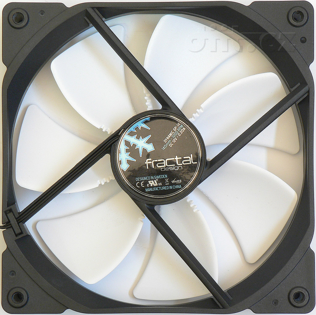 Předinstalovány jsou dva 140mm ventilátory Fractal Design GP-14 o tisíci otáčkách za minutu. Jsou vybaveny aerodynamickými zářezy a měly by mýt hydraulické ložisko (což má být kompromis mezi kluzným a skutečným kapalinovým; tuším nějakou zradu s mazacími kanálky). Mají přečerpat 68,4 kubických stop za minutu s tlakem 0,71 mm vodního sloupce a hlukem 18,9 dBA.