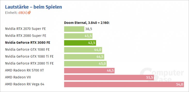 …nikoli sice na dvojnásobek GeForce RTX 2080 (která ve výše uvedeném grafu chybí), ale jak ukazuje recenze TechPowerUp, je GeForce RTX 3080 rychlejší o 67 % v 3840×2160, o 52 % v 2560×1440 a o 35 % v 1920×1080. Podobné výsledky předkládá i Tom'sHardware, který v 3840×2160 popisuje GeForce RTX popisuje jako kartu o 27 % rychlejší než Titan RTX, o 32 % rychlejší než GeForce RTX 2080 Ti, o 57 % rychlejší než GeForce RTX 2080 Super a o 69 % rycheljší než GeForce RTX 2080. Dodává, že výkon na úrovni dvojnásobku této karty se podařilo naměřit v jediném testu a to ve hře Doom Ethernal. Zrovna v té to ale hráči příliš neocení, protože už na GeForce RTX 2080 s Ultra detaily a 4k rozlišením běhá Doom na 84 FPS s minimy nad 60 FPS. Zdvojnásobení výkonu herní komfort v tomto titulu příliš neovlivní.