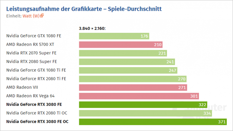 Spotřeba stoupla o 52 wattů oproti GeForce RTX 2080 Ti a o 81 wattů oproti GeForce RTX 2080 Super. Podle TechPowerUp je spotřeba GeForce RTX 3080 ve špičkách při herních testech o 122 wattů vyšší než spotřeba GeForce RTX 2080, o 73 wattů nad GeForce RTX 2080 Super a o 59 wattů nad GeForce RTX 2080 Ti. Absolutní rozdíl ve Furmarku činí (ve stejném pořadí) 145 / 90 / 85 wattů, ale to asi mnoho lidí trápit nebude, protože Furmark hraje málokdo.
