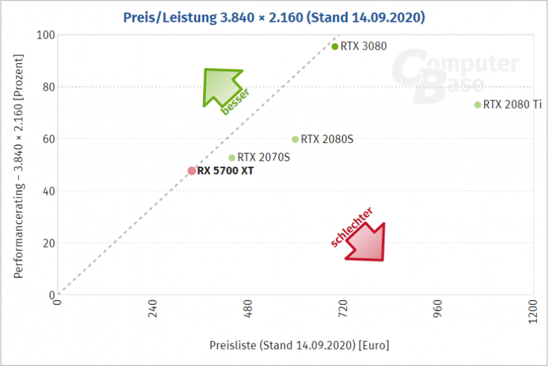 Pokud toto zapomeneme a budeme hodnotit čistě silné a slabé stránky karty, pak lze říct, že nejsilnější stránkou karty je poměr cena / výkon. Nvidia dala najevo, že když očekává v high-endu konkurenci, je ochotna nejen sáhnout po vyšším výkonu, než původně plánovala a postavit GeForce RTX 3080 na o třídu větším čipu, ale navíc ho je ochotna nacenit tak, že poměrem cena / výkon výrazně překonává minulou generaci a téměř dotahuje mainstreamovou nabídku konkurence: