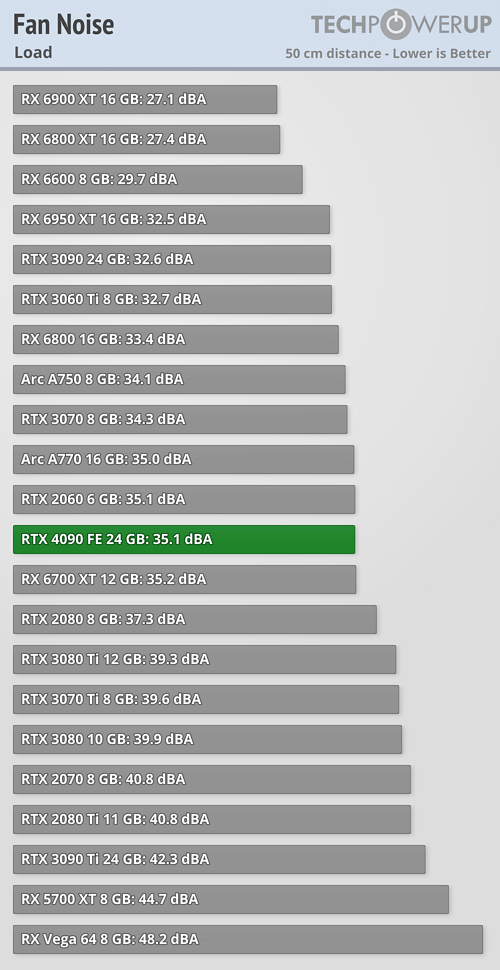 Hluk je trochu vyšší než u GeForce RTX 3090, ale zároveň nižší než u GeForce RTX 3090 Ti. S ohledem na změny chladiče (lopatky, průměr ventilátoru) bude podstatnější subjektivní vnímání hluku než zda je o pár decibelů vyšší nebo nižší.