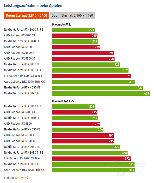 ComputerBase v zátěži Doom Eternal naměřila 432 wattů, tj. méně než TDP nebo GeForce RTX 3090 Ti.